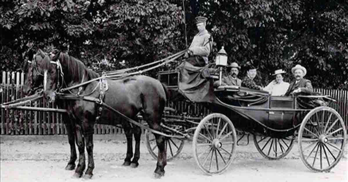 Vognmand og Hestehandler Søren Kjærs køretøj, kusken Henrik Kloster, senere fiskehandler i Thisted. Bryllupskøretøj ca. 1910