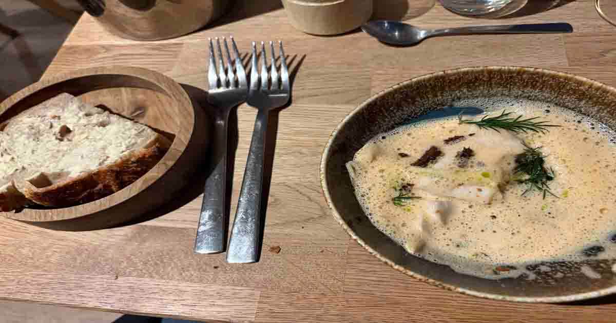 Forretten meget smagfuld. Vi manglede en sidetallerken til brødet, men bordet er meget lille på Bryggen, så der var næsten ikke plads.