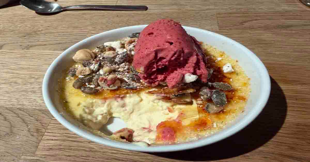 Desserten var lækker, men bestanddelene må forblive en hemmelighed. Uden menukort er vi ilde stedt. Hvis I bestiller dette tilbud til kr. 250 pr. kuvert, kan I jo spørge på Bryggen efter menuen.